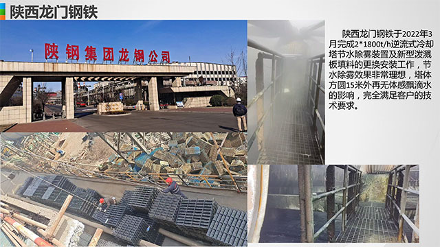 陜西龍門鋼鐵于2022年3月完成2*1800t/h逆流式冷卻塔節(jié)水除霧裝置及新型潑濺板填料的更換安裝工作,節(jié)水除霧效果非常理想,塔體方圓15米外再無體感飄滴水的影響,完全滿足客戶的技術(shù)要求。